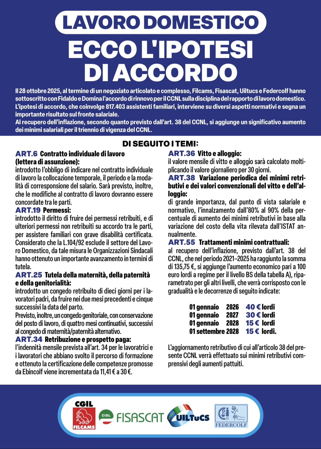 Dopo la firma dell’Ipotesi di accordo per il rinnovo del Contratto collettivo nazionale del lavoro domestico, sottoscritta il 28 ottobre 2025 dalle organizzazioni sindacali di categoria Filcams Cgil, Fisascat Cisl, Uiltucs e Federcolf, prendono ufficialmente avvio le consultazioni sindacali con le lavoratrici e i lavoratori del settore.